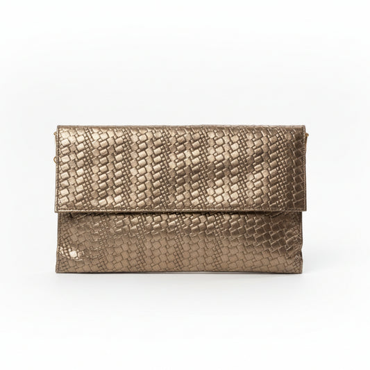 Bolso tipo sobre y piel 100% vacuno con textura en color bronce