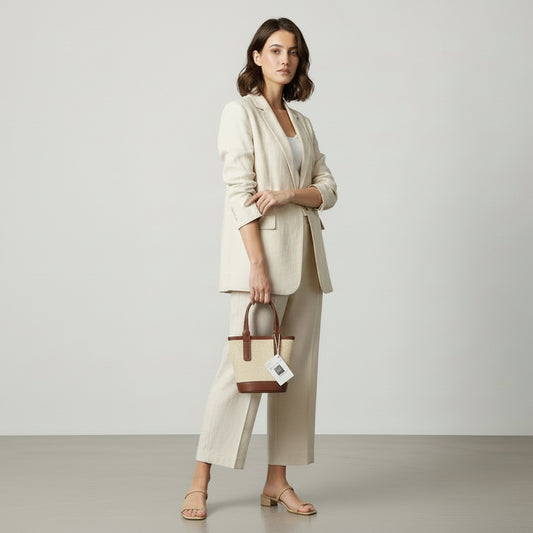 Bolso tipo bucket pequeño en color beige y detalles de estilo cuero en chocolate