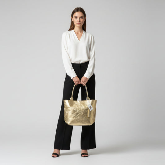Bolso de piel 100% vacuno tipo shopper alargado en dorado con borla y monedero