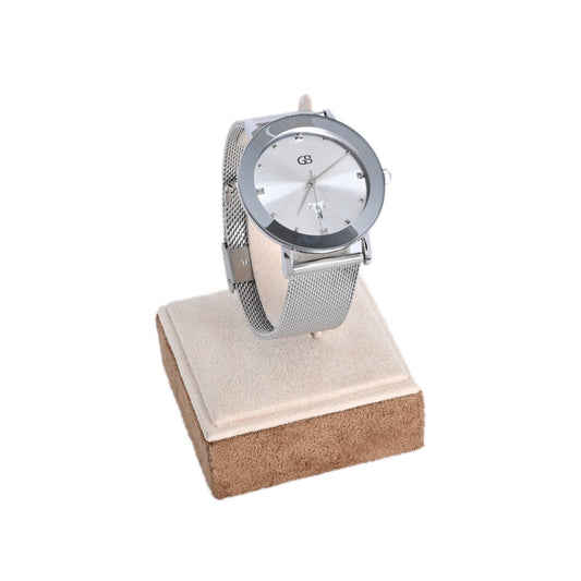 Reloj de aguja con correa de malla y tachuelas para la hora plata