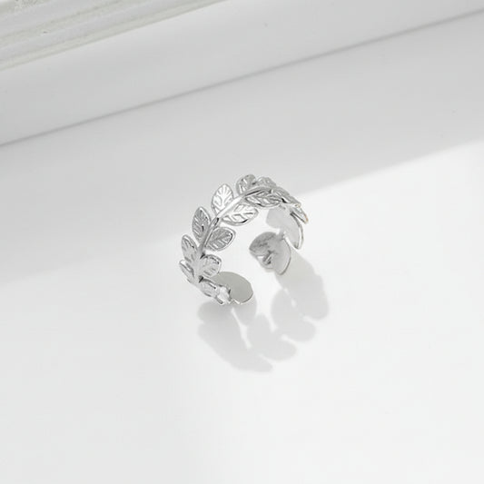 Anillo de acero con hojas y textura rugosa en acabado brillante