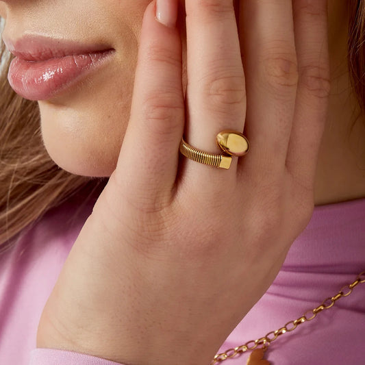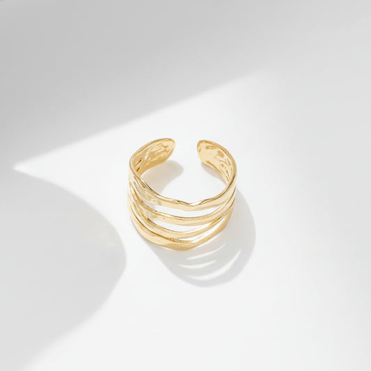 Anillo de acero con dos ramificaciones en forma de lágrima en acabado oro