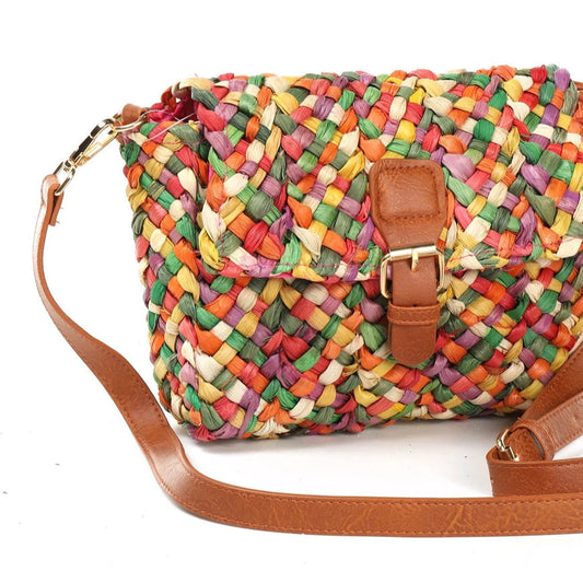 Bolso bandolera de paja multicolor con cierre con hebilla y bandolera camel - mbyou