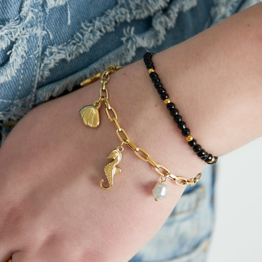 Pulsera acero de eslabones con dijes estrella marina, conchas y perlas acabado oro- mbyou
