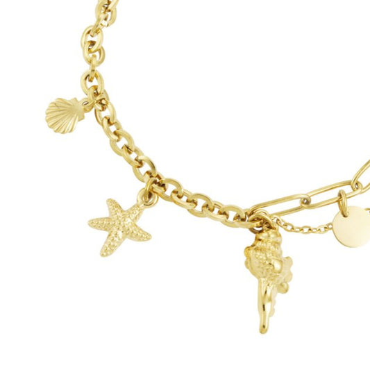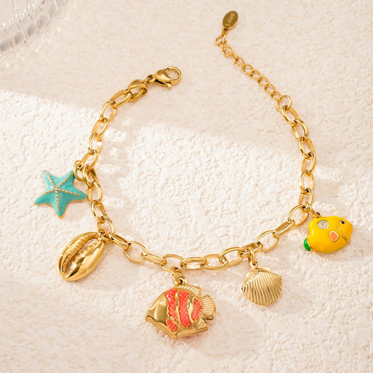 Pulsera acero de eslabones con dijes estrella, conchas y peces acabado oro - mbyou