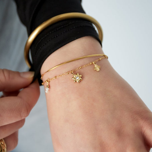 Pulsera acero de cordón y eslabones con dijes flor con brilli central, trébol y perlas acabado oro- mbyou