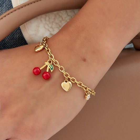 Pulsera acero de eslabones con dijes corazón, cerezas y brillantes acabado plata - mbyou