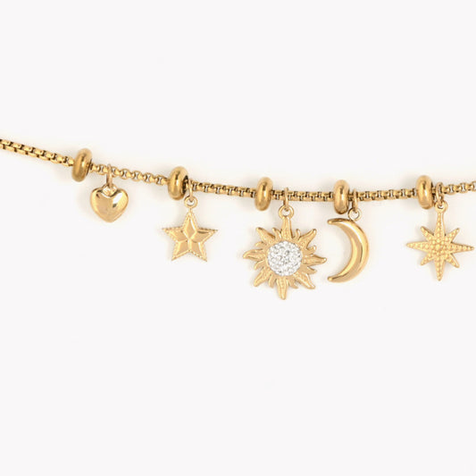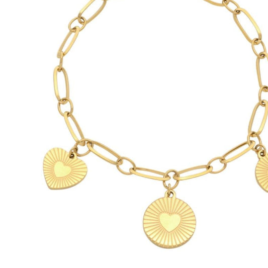 Pulsera de acero con dijes de monedas con corazones acabado oro