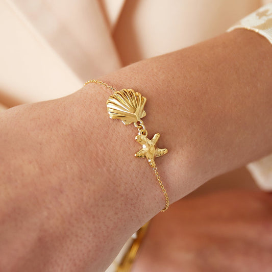 Pulsera de acero inoxidable concha y estrella de mar acabado oro - mbyou