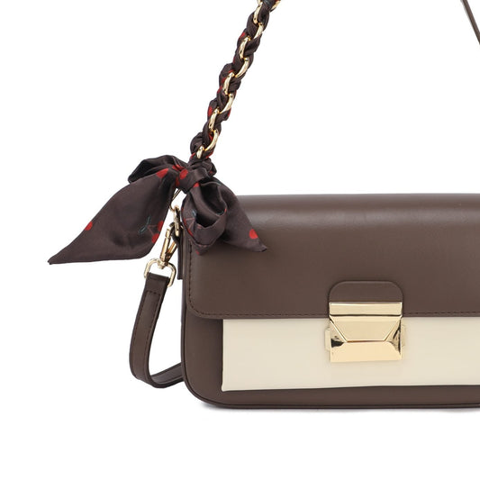 Bolso rectangular rígido con solapa bicolor y pañuelo incorporado en la cadena color marrón chocolate y beige - mbyou