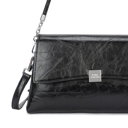 Bolso de hombro mediano con solapa y textura arrugada y acabado plata color negro - mbyou