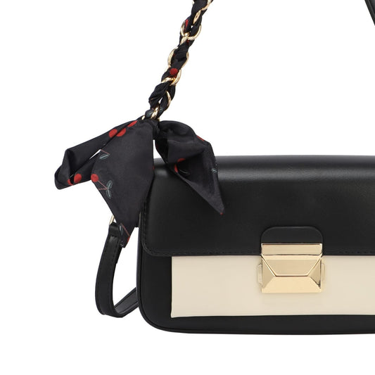 Bolso rectangular rígido con solapa bicolor con pañuelo incorporado en la cadena color negro y beige - mbyou