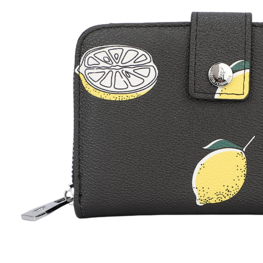 Monedero tamaño mediano con botón de click y cremallera efecto piel en color negro con estampado de limones - mbyou