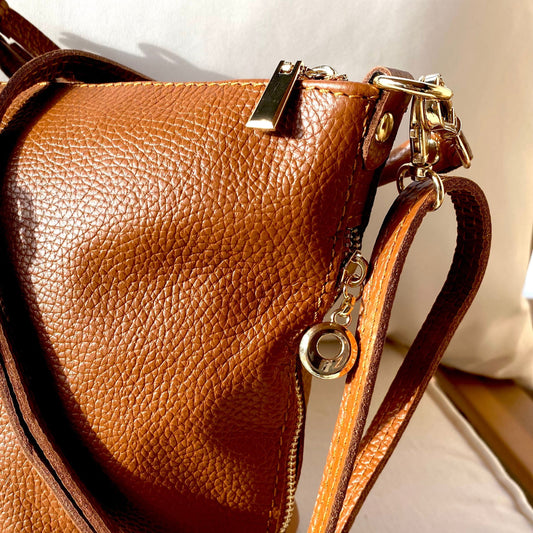 Bolso de piel 100% auténtica liso con cremalleras laterales color camel - mbyou