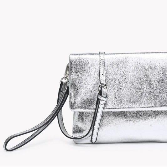 Bolso bandolera estilo sobre con solapa plata metalizado