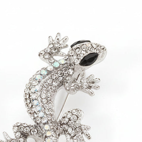 Broche en forma de lagartija en color blanco, ojos negros y acabado plata