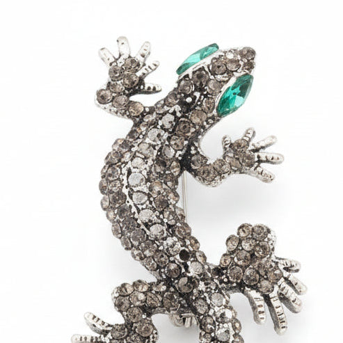 Broche en forma de lagartija en color gris, ojos verdes y acabado plata