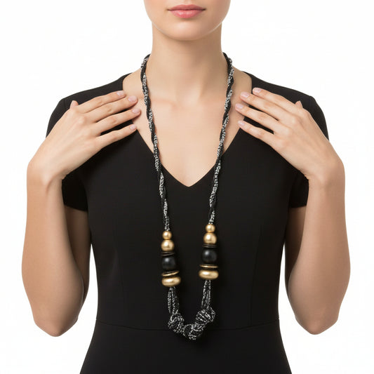 Collar largo artesanal trenzado con cuentas y detalles en dorado