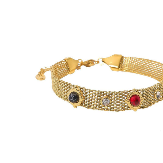 Pulsera de acero piedra natural en forma de corazón rojo y circonitas acabado oro