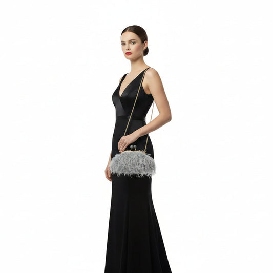 Bolso fiesta de mano con plumas gris claro