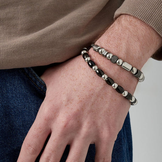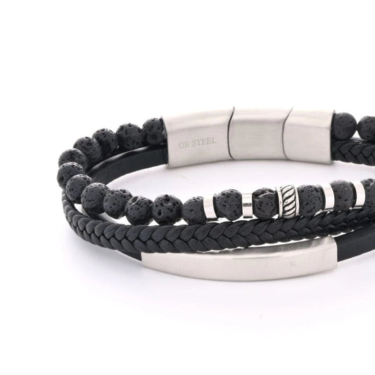 Pulsera de hombre de acero inoxidable triple con detalles negros y plata y bolitas volcánicas - mbyou