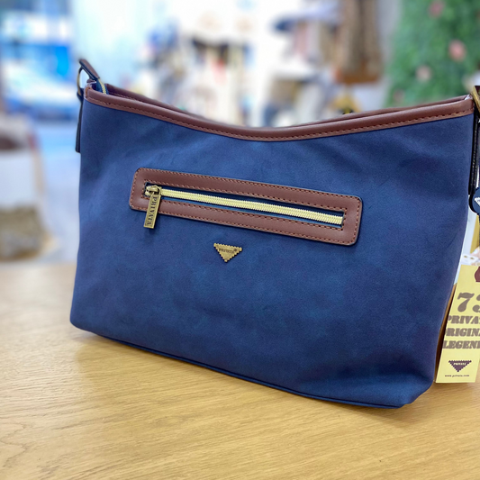 Bolso bandolera marrón chocolate y azul marino efecto ante de Privata.