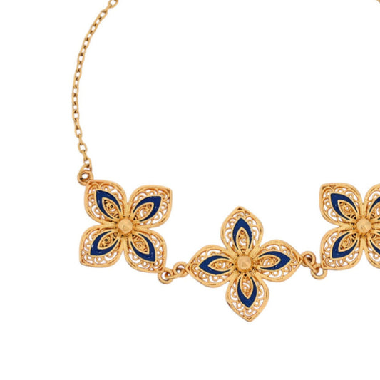 Pulsera con flores en azul noche y diseño de filigrana acabado oro - mbyou