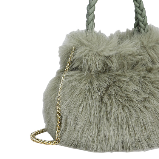 Bolso de mano y bandolera tipo limosnera con pelaje en color verde y el asa trenzada - mbyou