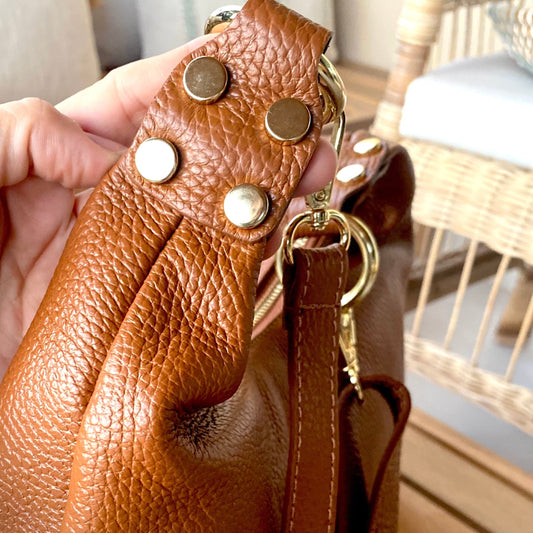 Bolso liso de piel 100% auténtica camel con detalle tachuelas doradas en la hombrera