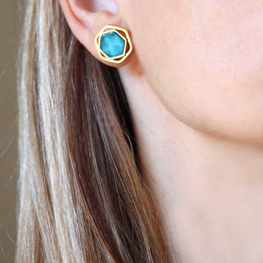 Pendientes cortos de acero inoxidable quirúrgico forma floral con piedra turquesa acabado oro - mbyou