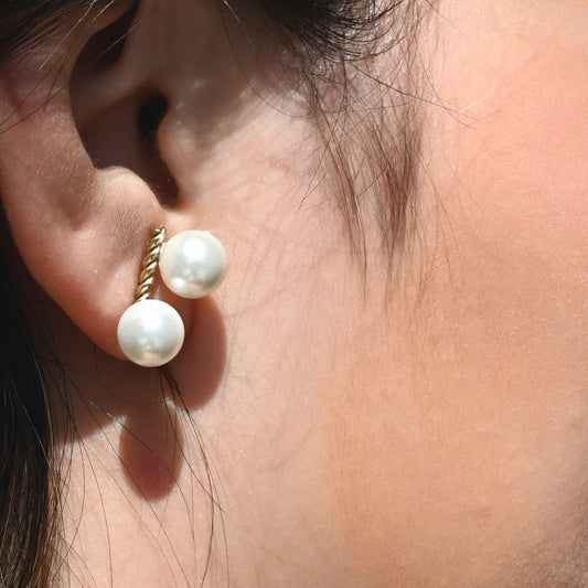 Pendientes de acero inoxidable con dos perlas unidas por un palo trenzado acabado oro - mbyou