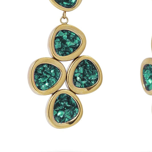 Pendientes largos de acero quirúrgico con conjunto de drusas en verde acabado oro - mbyou
