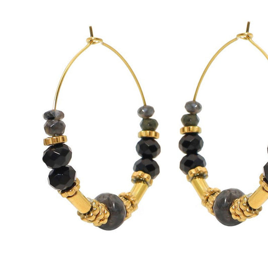 Pendientes aro de acero inoxidable con cristales negros acabado oro - mbyou