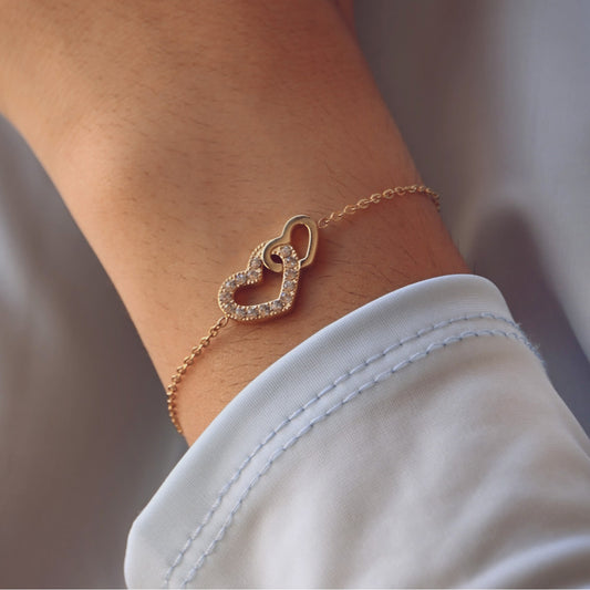 Pulsera de acero corazones entrelazados con brillantes oro