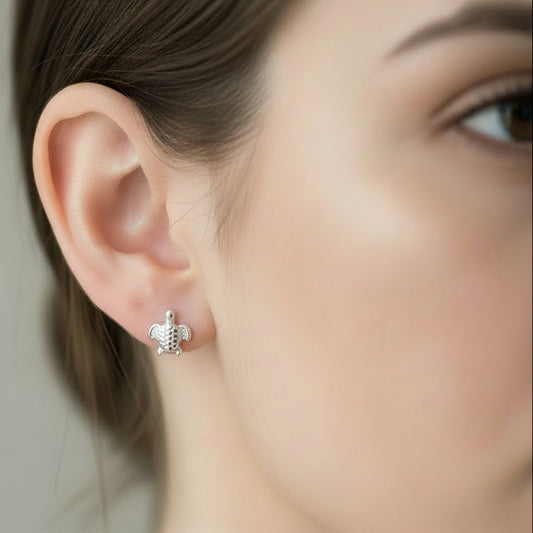 Pendientes cortos y pequeños de acero en forma de tortuga acabado plata