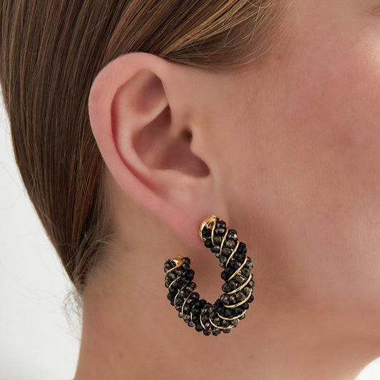 Pendientes de metal con cristales en color negro y un aro con acabado mate plata - mbyou
