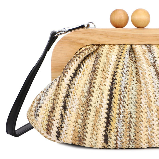 Bolso pochette y bandolera tipo rafia con rayas de colores nude y cierre de madera