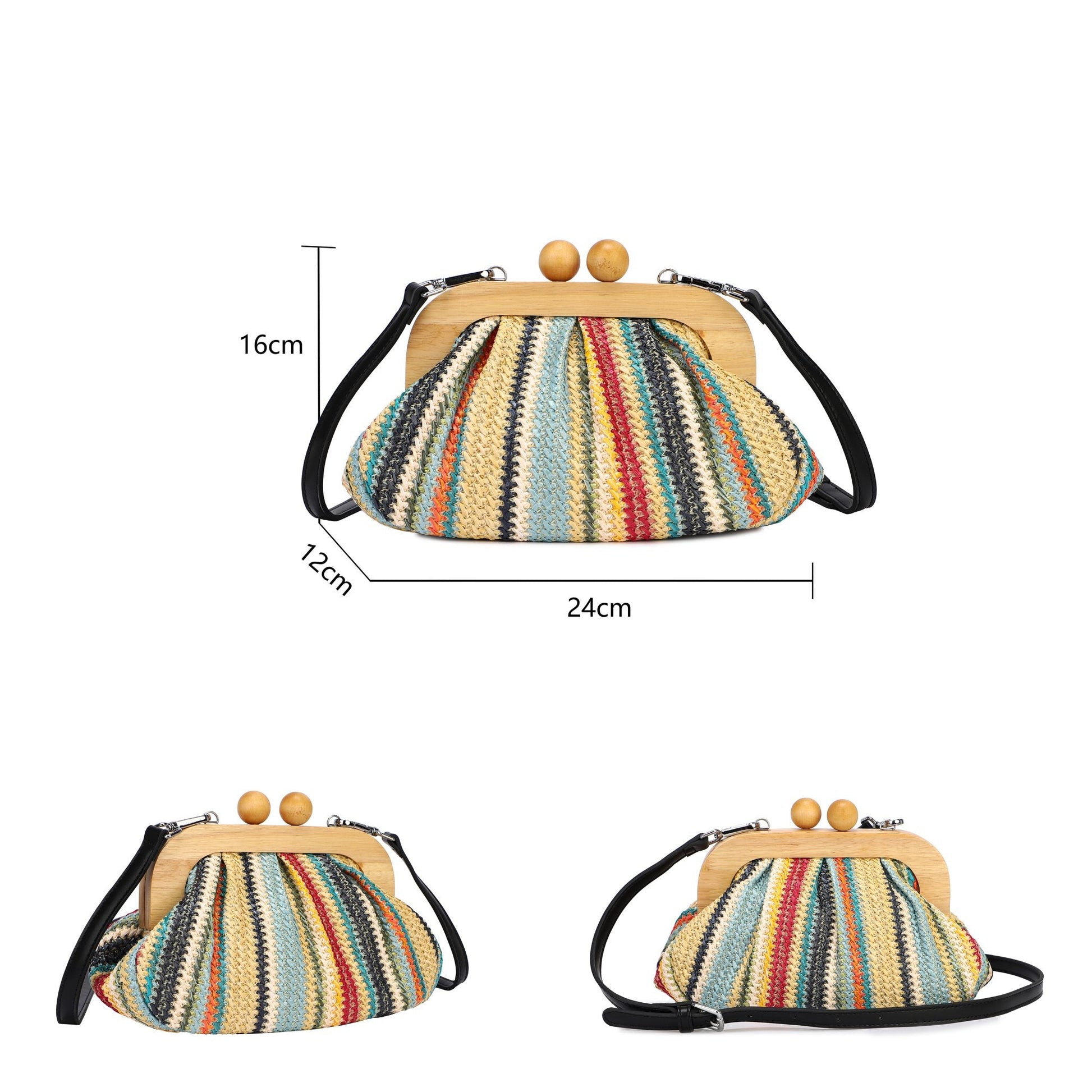 Bolso de mano hecho de rafia y madera que contiene un diseño a rayas de colores y el cierre hecho de madera. El interior del bolso está forrado de tela en color marrón y contiene dos bolsillos interiores, uno de ellos con cremallera. También lo puedes utilizar como bolso de hombro, ya que, contiene un asa de color negro.