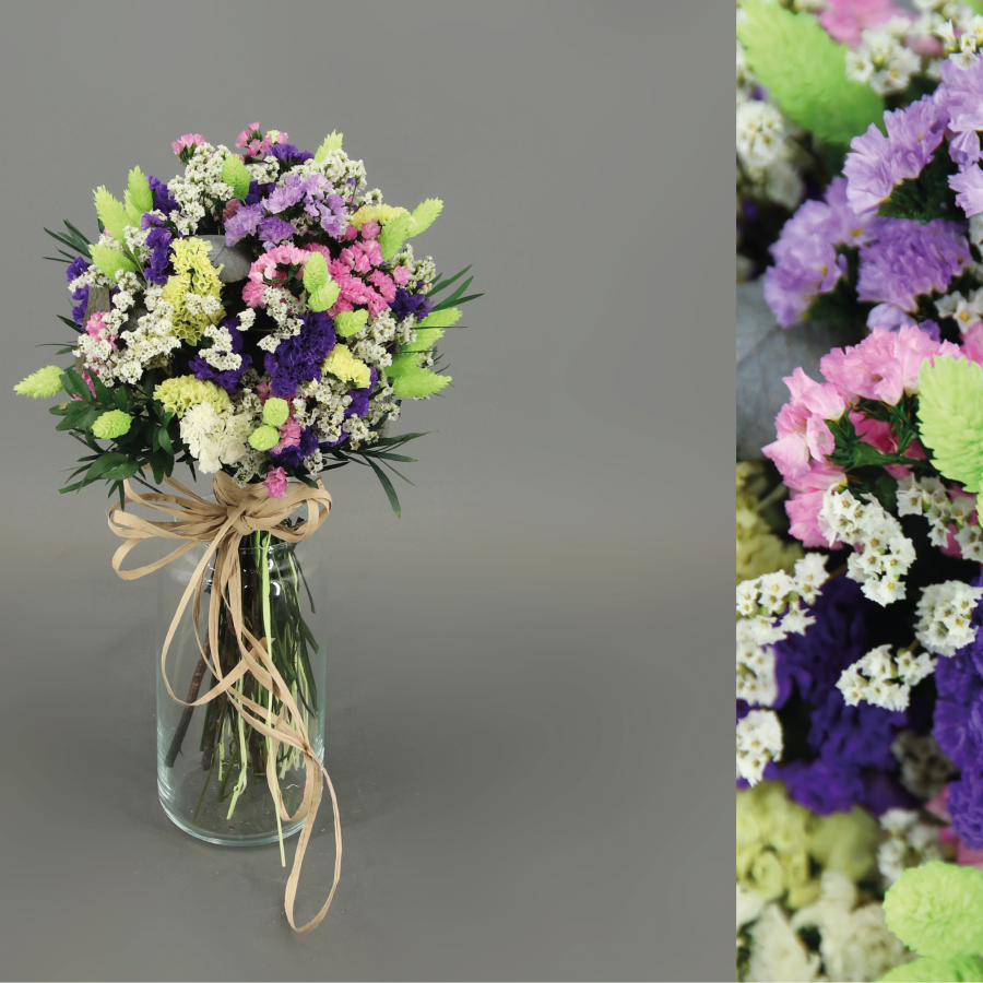 Gift box consisting of a golden raffia box adorned with preserved and artificial scented flowers in white, yellow and green tones. Does not include semi-jewel
