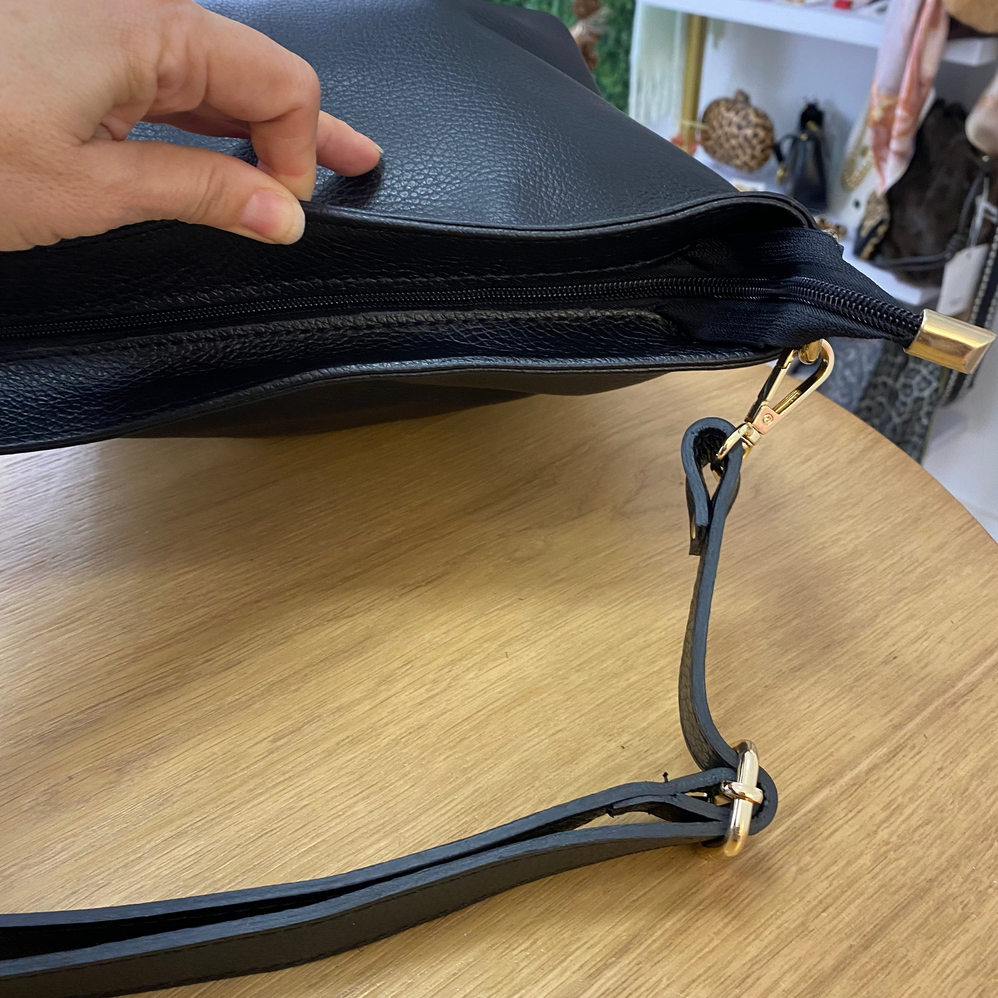 Bolso bandolera con forma rectangular de piel 100% vacuno, con bandolera también de piel regulable y removible. Detalles en dorado. El interior está forrado de tela de color negro y contiene un bolsillo interior con cremallera. Diseñado y fabricado en Italia.