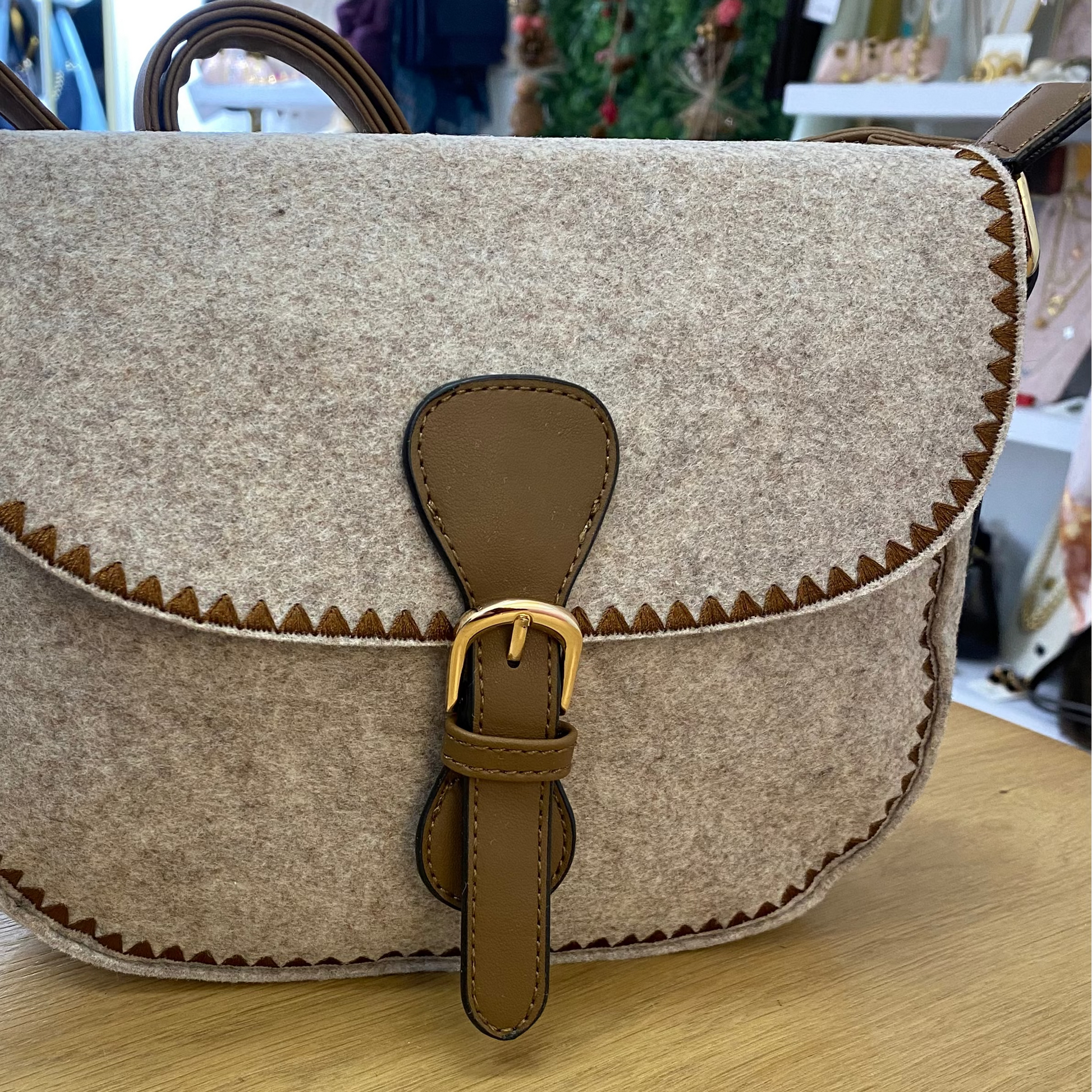 Bolso bandolera de fieltro en color marrón clarito, que contiene detalles bordados en marrón mas fuerte y partes de material sintético vegano, como la correa o la parte del cierre del mismo color. El cierre es imantado y con click. La correa es ajustable pero no removible.