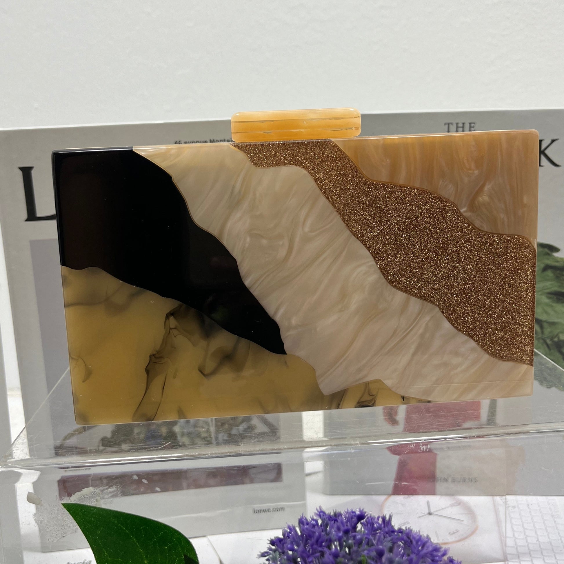 Sac à main orné de plumes. Fermeture dorée avec paillettes. Chaîne dorée pour le porter en bandoulière.