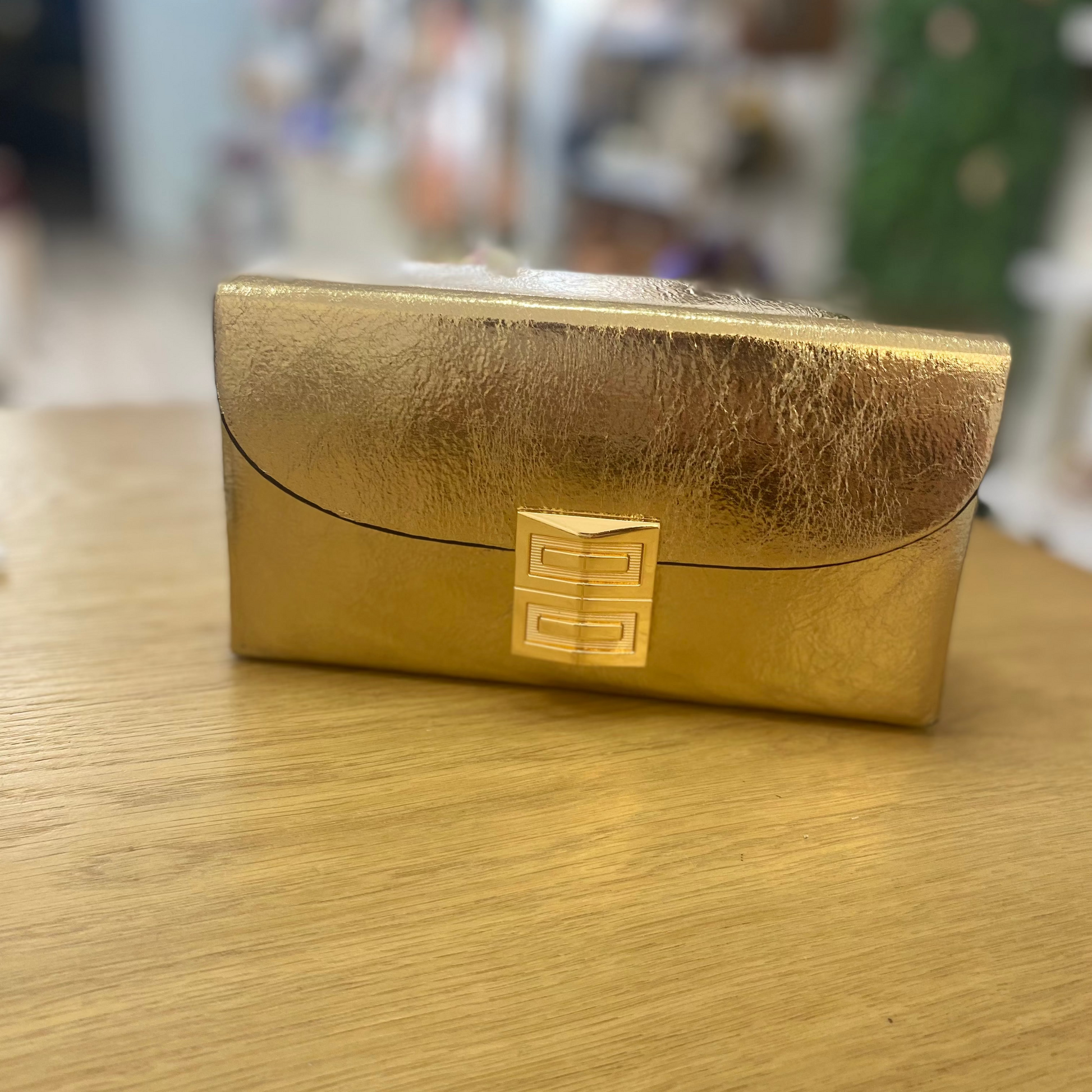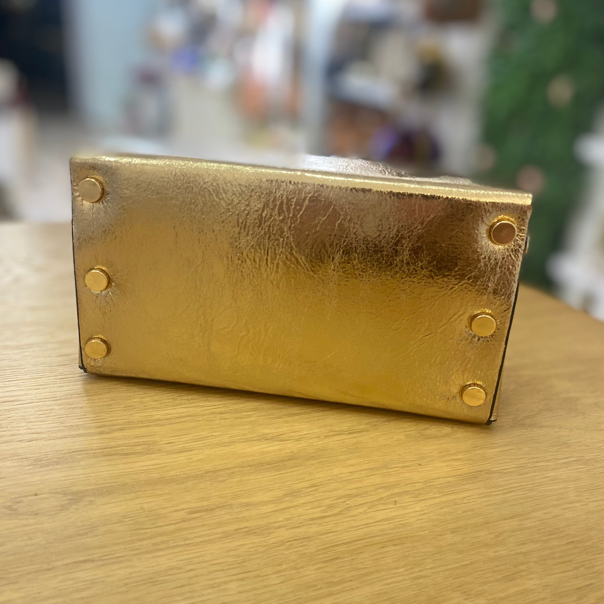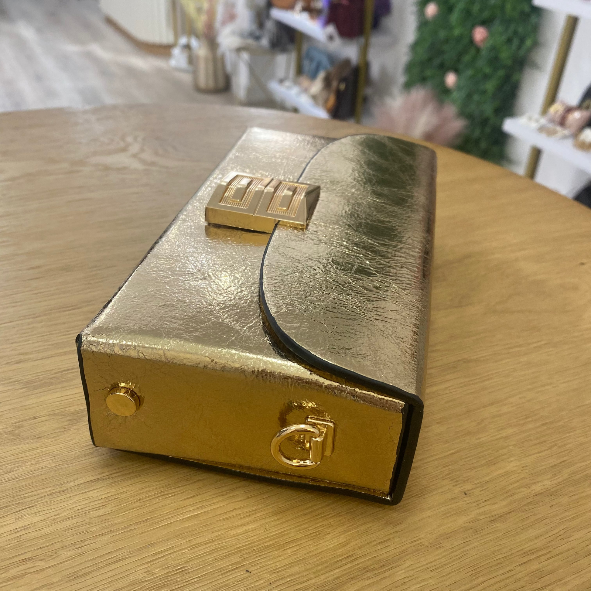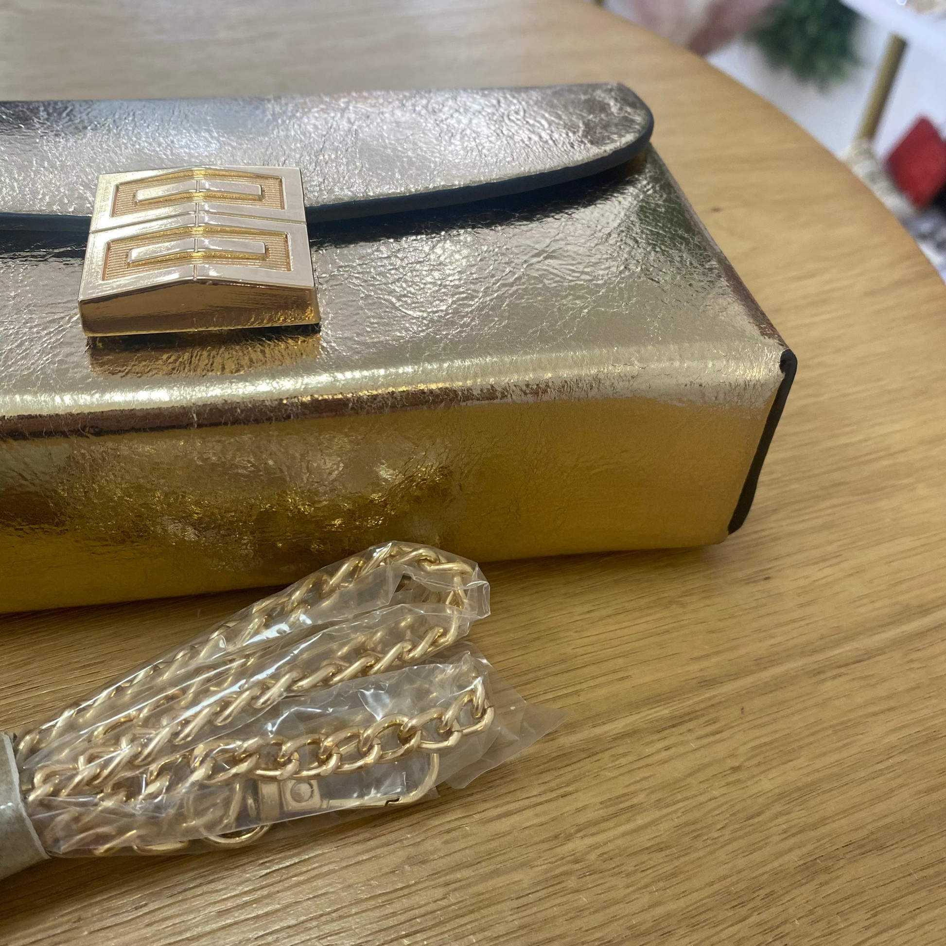 Sac à main orné de plumes. Fermeture dorée avec paillettes. Chaîne dorée pour le porter en bandoulière.