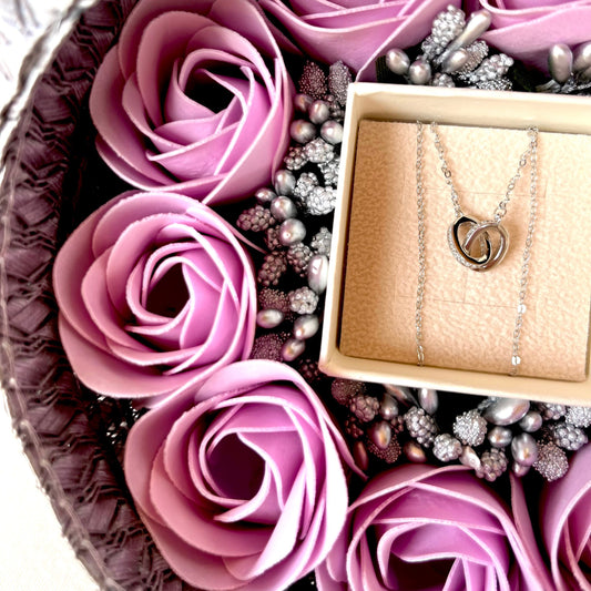 Cofre joyero regalo gris pequeño con flores de jabón y collar de plata anillos enlazados