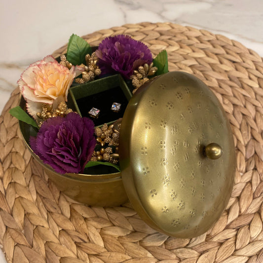 box con joyero metálico y flores artificiales púrpura y salmón + semijoya