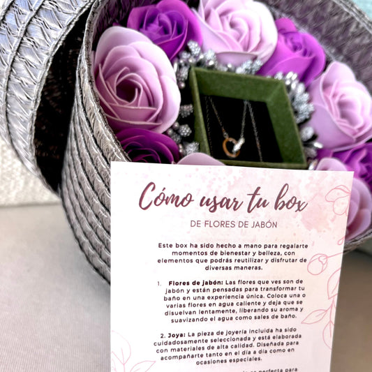 Cofre joyero regalo gris pequeño con flores de jabón moradas y collar de plata anillos enlazados