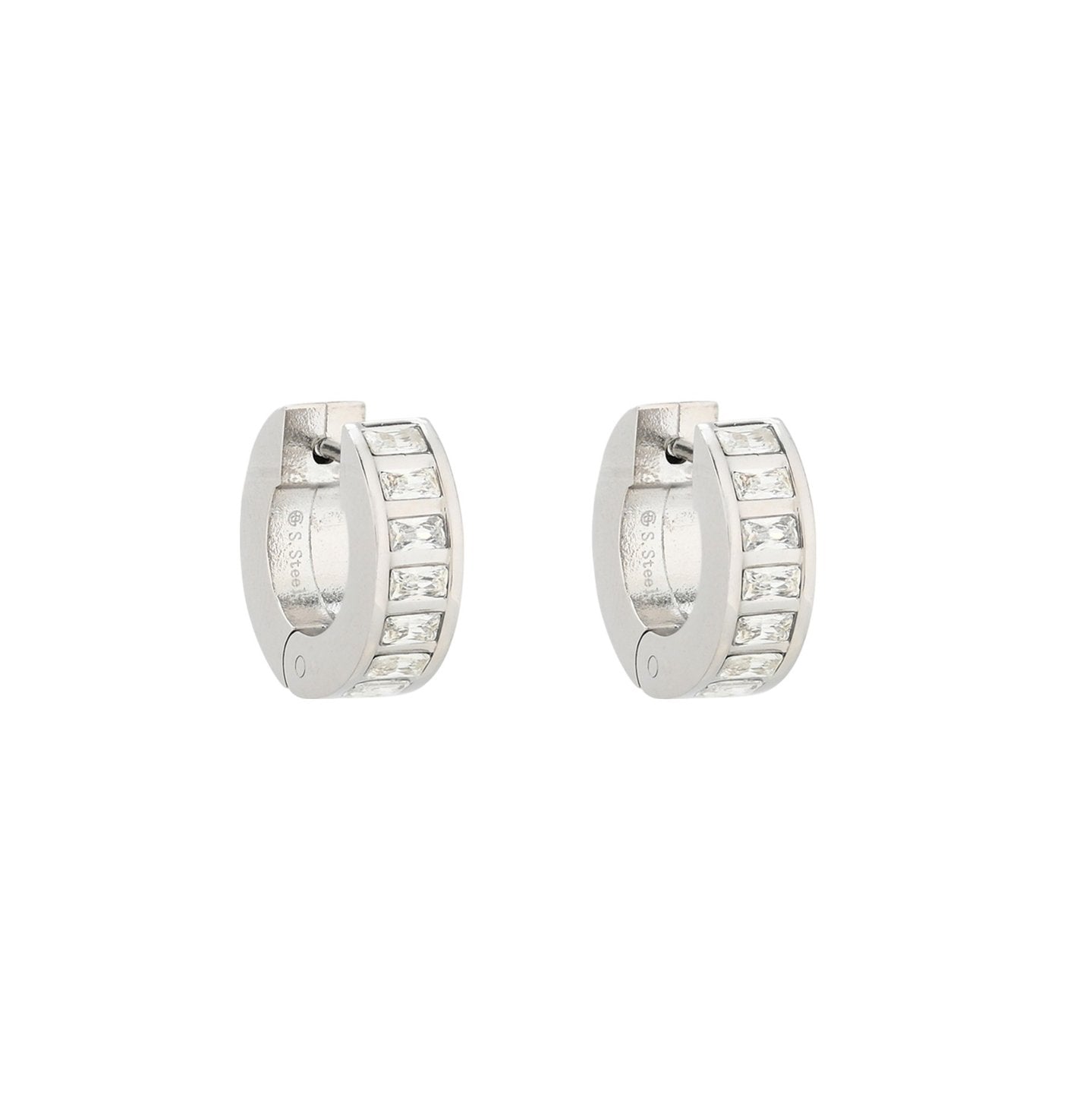 - Argollas de acero inoxidable en forma de aro grueso con circonitas alargadas facetadas alrededor de todo el aro.