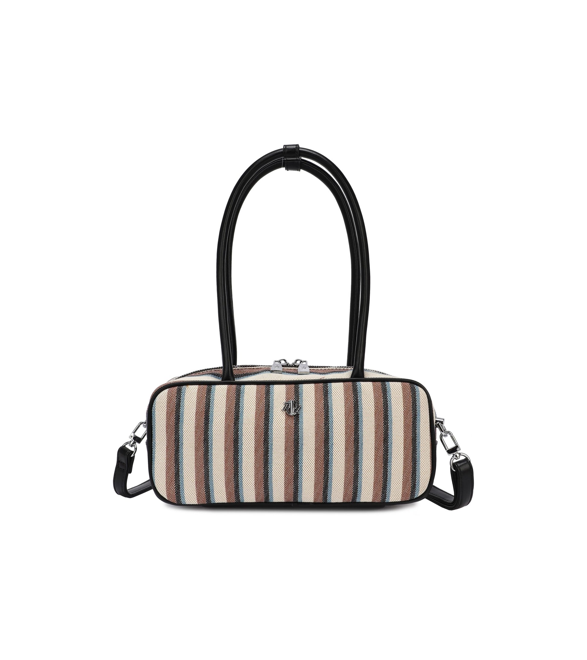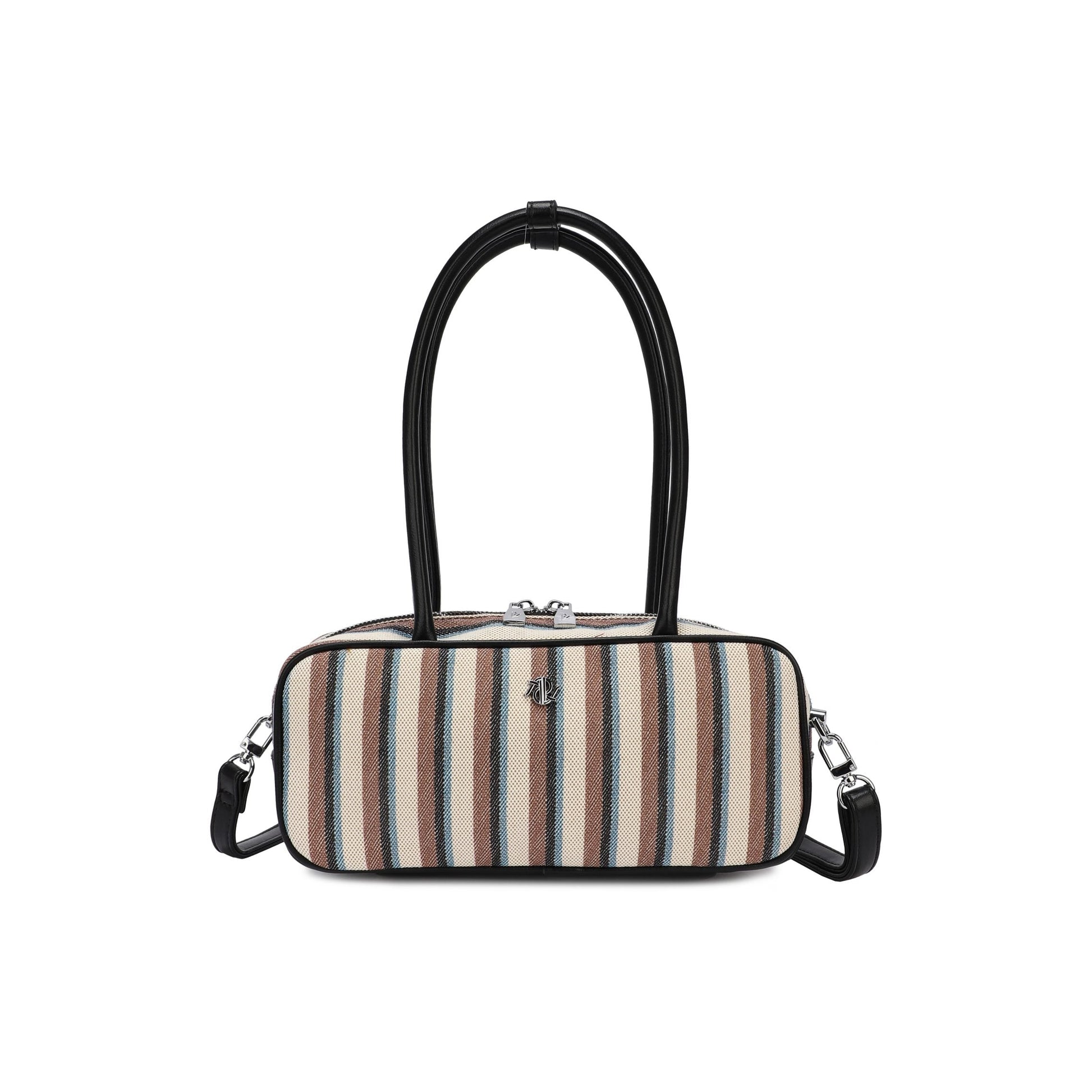 Bolso de hombro con forma estrecha y alargada a rayas de color marrón, negro, azul y beige, contiene asas largas y el acabado de plata. El material es cosido excepto las asas y la base del bolso que son de tipo cuero. También lleva un asa para utilizar el bolso de bandolera del mismo color que el asa, regulable y extraíble. El interior está forrado de tela de color negro y contiene dos bolsillos interiores, uno de ellos con cremallera.