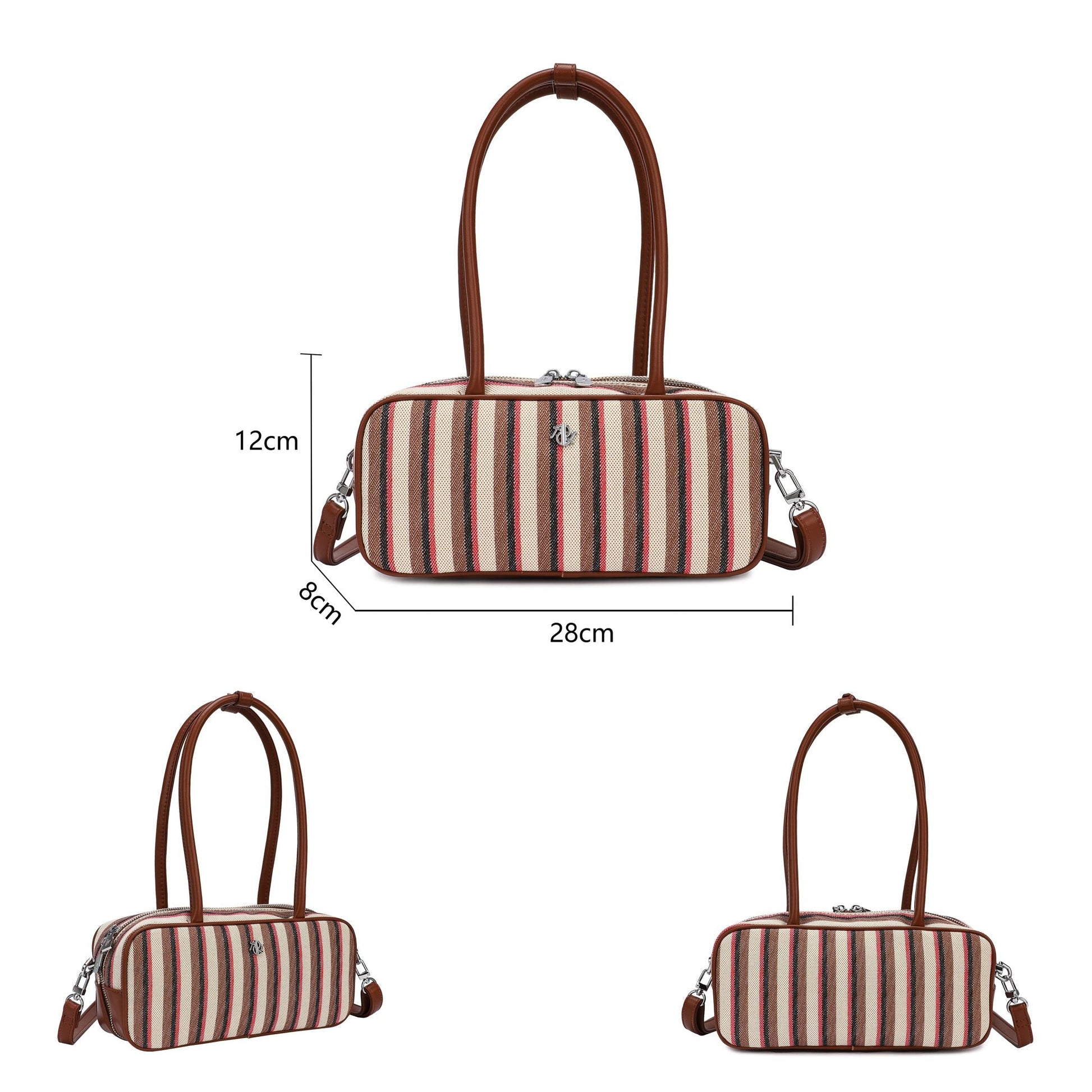 Bolso de hombro con forma estrecha y alargada a rayas de color marrón, negro, azul y beige, contiene asas largas y el acabado de plata. El material es cosido excepto las asas y la base del bolso que son de tipo cuero. También lleva un asa para utilizar el bolso de bandolera del mismo color que el asa, regulable y extraíble. El interior está forrado de tela de color marrón y contiene dos bolsillos interiores, uno de ellos con cremallera.