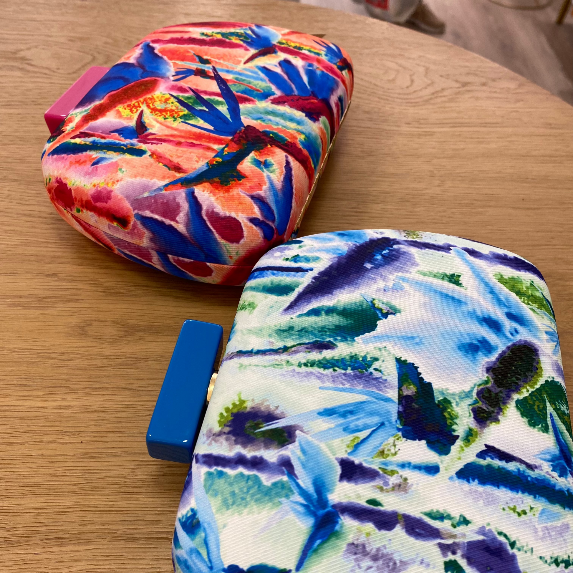Bolso de mano fiesta tipo pochette con estampado abstracto en tonos rosa fucsia, naranjas y azules y cierre fucsia -mbyou